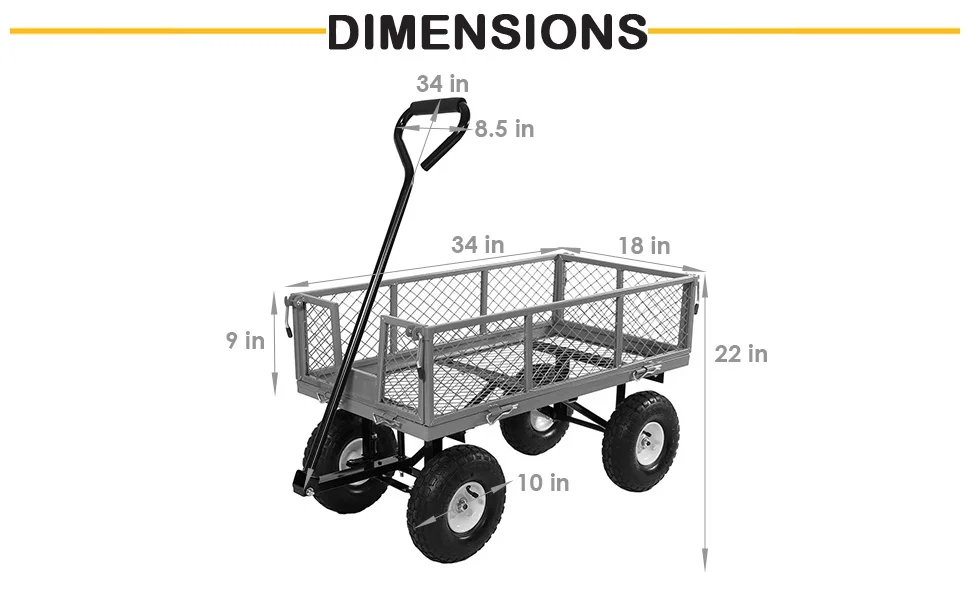 This heavy duty wagon can load up to 560 lbs. It is made of high-quality metal and fully welded. All-iron mesh bed and four sides